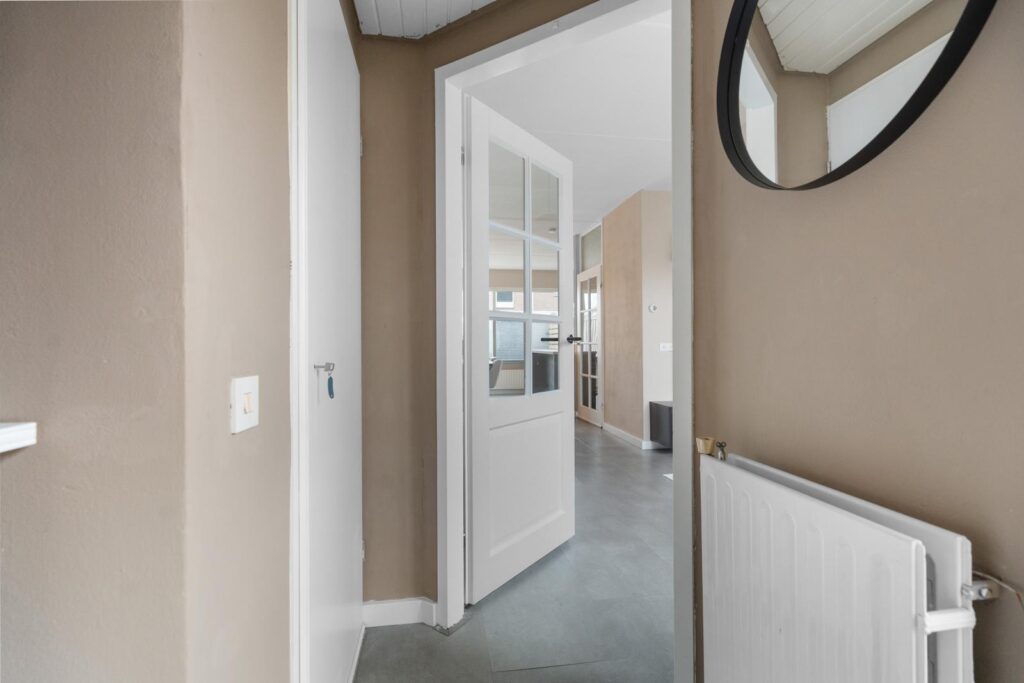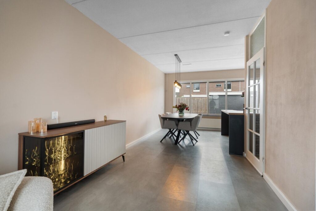 Via de voortuin bereik je de entree van de woning. Hier bevinden zich het toilet, de meterkast en de toegang tot de woonkamer. Bij binnenkomst in de woonkamer valt meteen de prettige sfeer op. De woonkamer is licht en ruim opgezet en biedt voldoende plek voor een comfortabele en gezellige zithoek waar je heerlijk kunt ontspannen. Dankzij de grote raampartijen aan de voor- en achterzijde komt er veel natuurlijk licht naar binnen, wat zorgt voor een warme en uitnodigende woonomgeving.