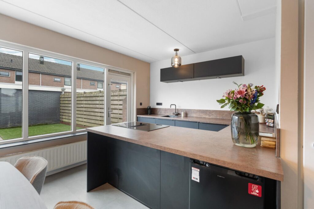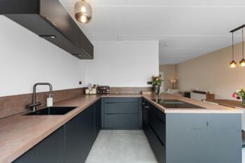 De open indeling loopt praktisch door naar de eettafel en moderne keuken. Deze indeling zorgt voor een fijne leefruimte waarin koken, eten en samenzijn samenkomen. De moderne keuken uit 2022 heeft een strak design en een praktische opstelling met volop werkblad- en kastruimte. Daarnaast is de keuken van alle gemakken voorzien en uitgerust met onder andere een Quooker, combi-oven en een inductiekookplaat met geïntegreerde afzuiging. Hier kook je met plezier terwijl je contact houdt met familie of gasten aan de eettafel.
