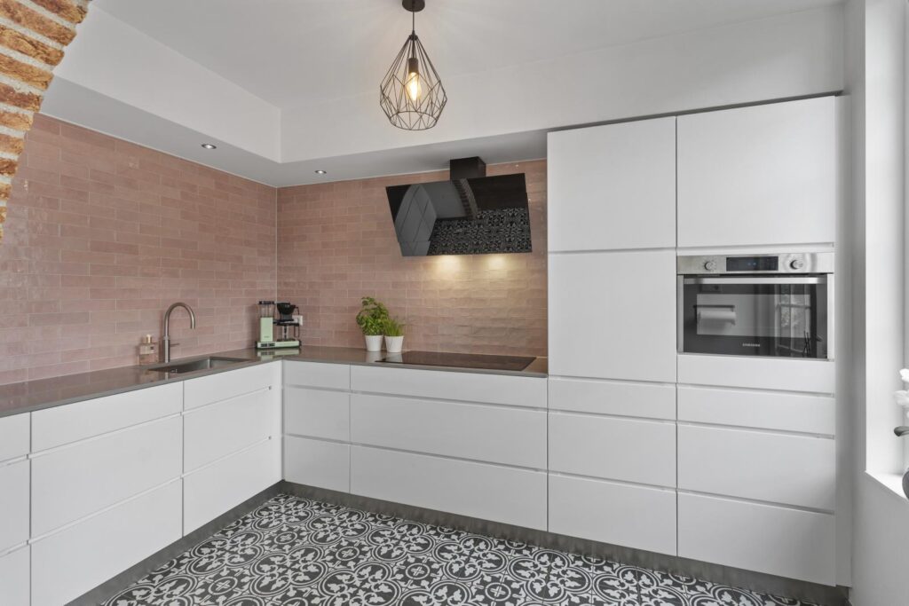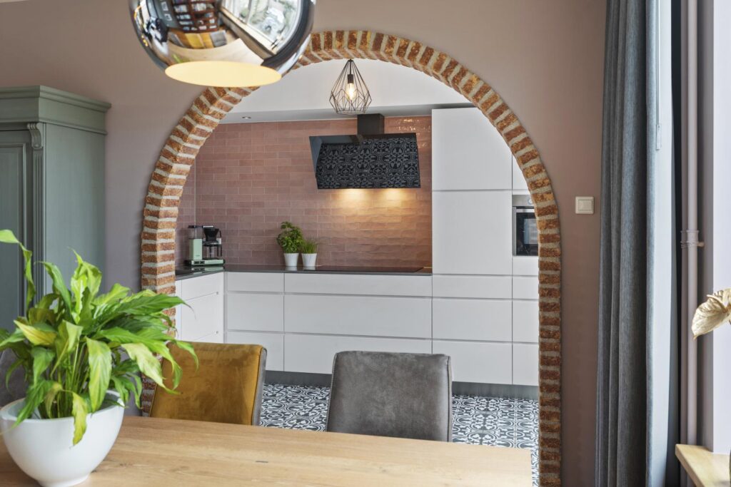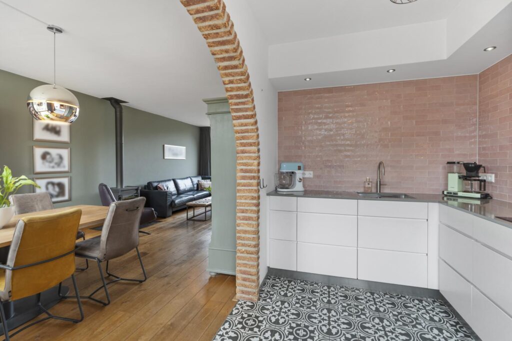 De moderne open keuken vormt een mooi geheel met de leefruimte. Het strakke design met witte fronten wordt gecombineerd met warme accenten zoals de tegelwand en de karakteristieke gemetselde boog. De keuken is praktisch ingericht en voorzien van diverse inbouwapparatuur, een fijne plek voor iedereen die van koken en gezelligheid houdt. Zie je het al voor je? Koken met de deuren open en daarna samen buiten eten terwijl de avondzon langzaam ondergaat.