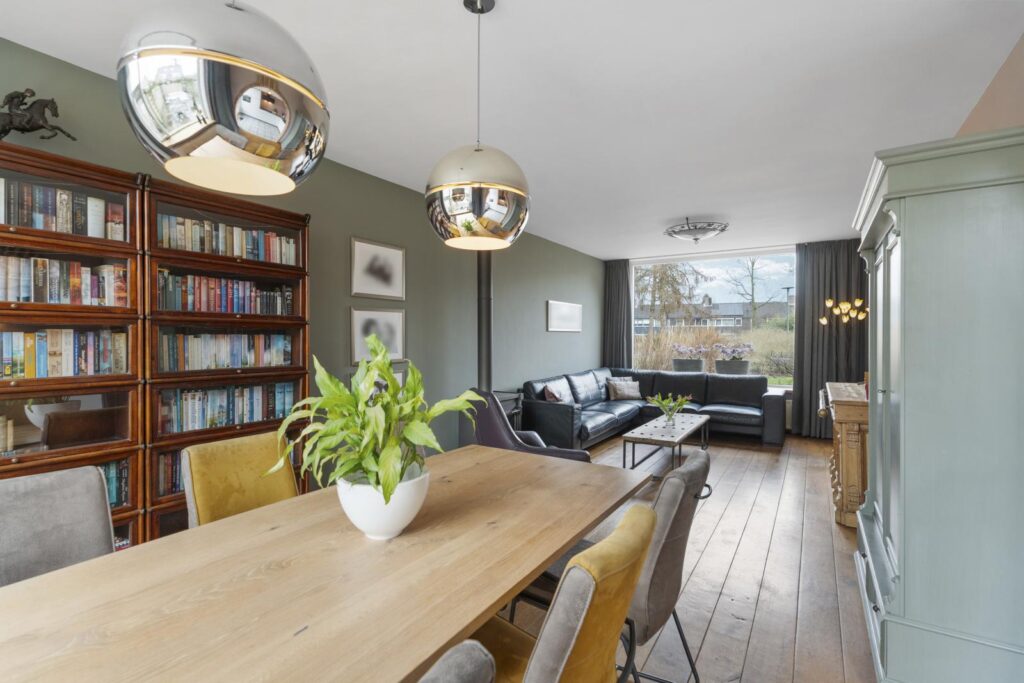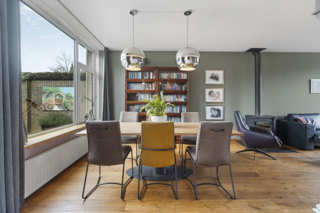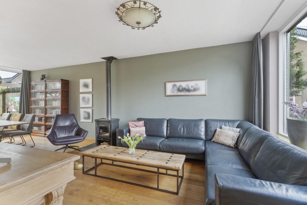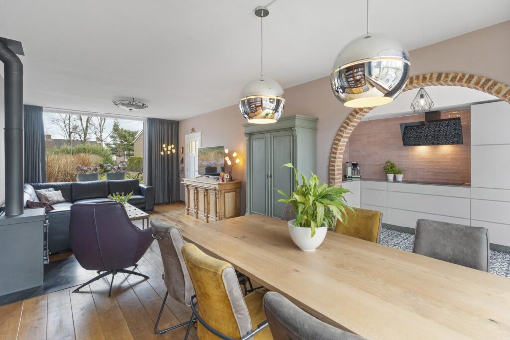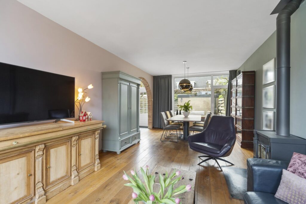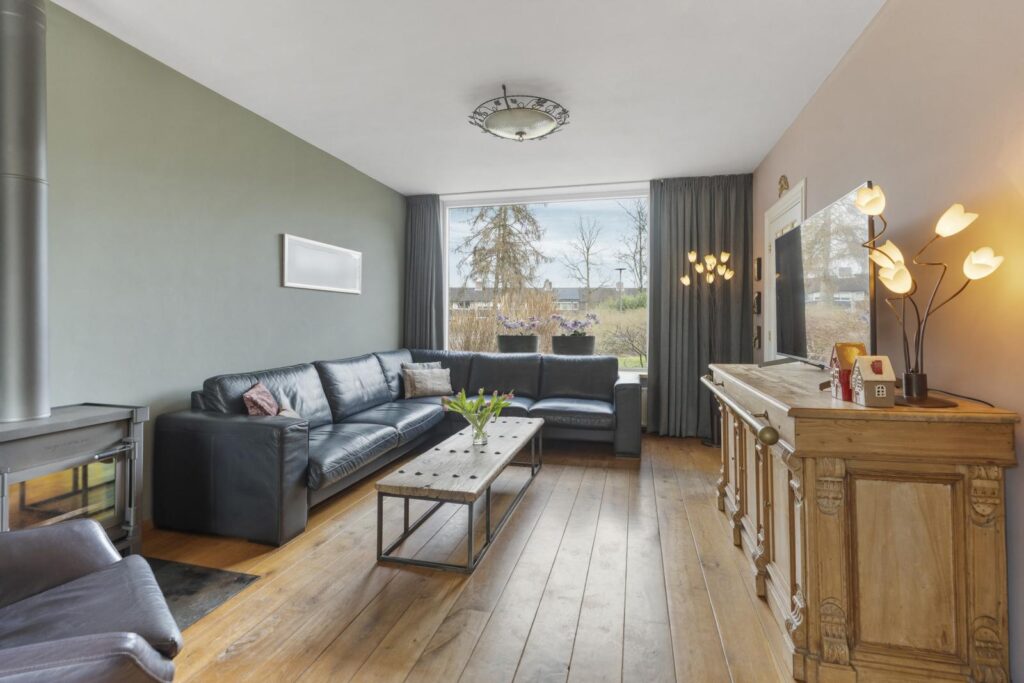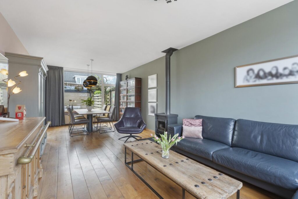 De woonkamer is een heerlijke plek om te ontspannen. Grote raampartijen aan de voor- en achterzijde zorgen voor een prachtige lichtinval en een ruimtelijk gevoel. De warme houten vloer en de sfeervolle houtkachel geven de ruimte karakter en maken het een plek waar je graag samenkomt met familie en vrienden. Aan de achterzijde is voldoende ruimte voor een royale eettafel met prachtig uitzicht op de zonnige tuin.