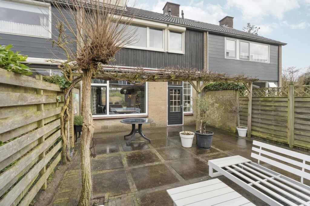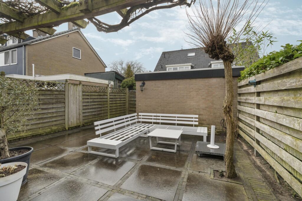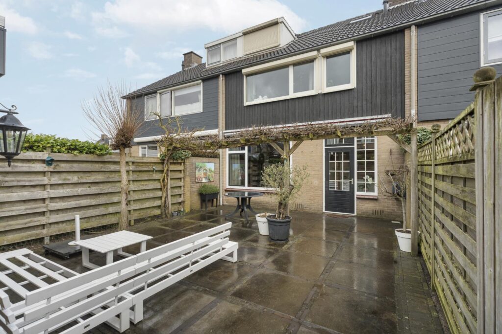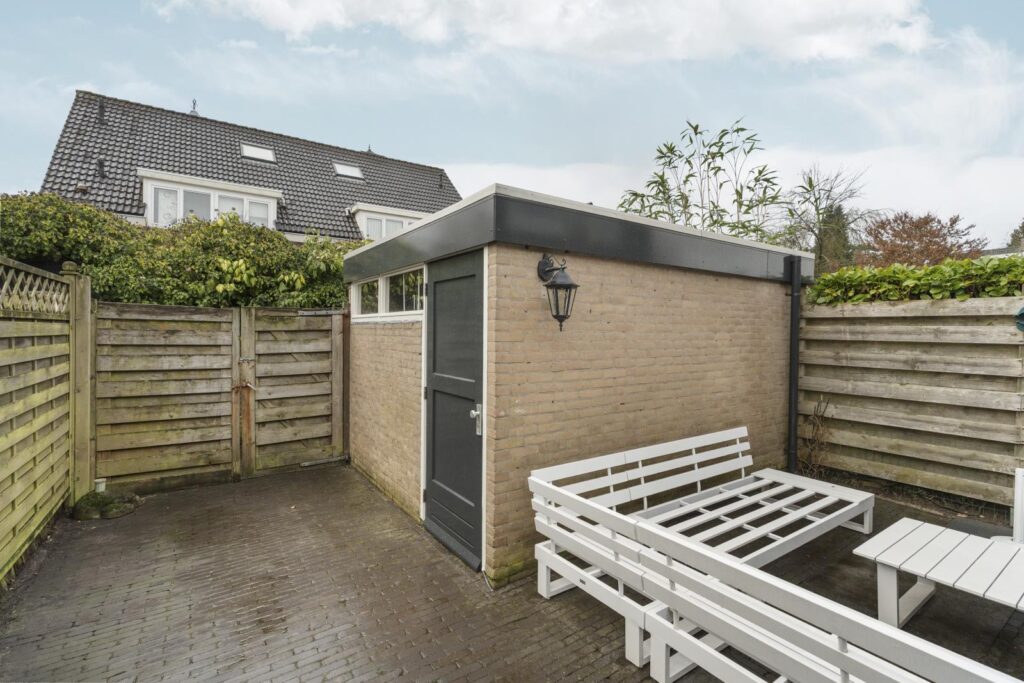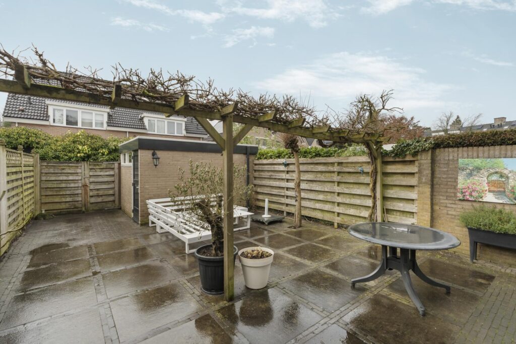 Via de achterdeur bereik je de onderhoudsvriendelijke achtertuin met een gezellige pergola en meerdere zitplekken. Hier kun je heerlijk genieten van een kop koffie in de ochtendzon of lange zomeravonden met vrienden. Achter in de tuin bevindt zich een praktische berging voor fietsen en tuinspullen.