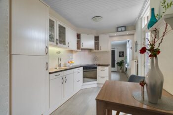 De woonkamer loopt soepel over in de keuken, waar je heerlijk samen kunt koken en gezellig kunt tafelen. Aangrenzend bevindt zich een praktische kantoorruimte, ideaal voor wie thuiswerkt of een hobbykamer zoekt. Op de begane grond beschik je over twee schuren (inpandig én een van buiten bereikbaar) en een separate garagebox.